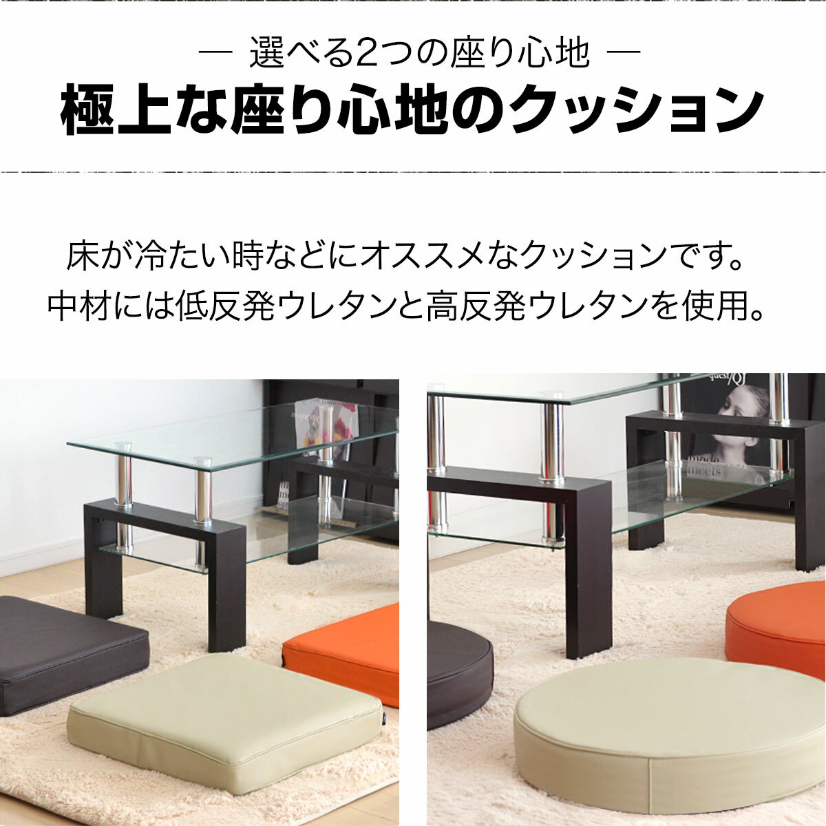 ・スクウェアタイプ ・ラウンドタイプ カラー: ・ブラック ・ベージュ ・ブラウン ・レッド ・オレンジ サイズ: ・スクウェアタイプ : (約)45cm×45cm×8cm ・ラウンドタイプ : (約)φ45cm×8cm クッション材: ウレタンフォーム カバー: PVCレザー低反発+高反発が作り出す、極上な座り心地! PVCレザークッション 5カラー 【スクウェアタイプ:45x45x8cm/ラウンドタイプ:φ45x8cm】 商 品 詳 細 タイプ ・スクウェアタイプ ・ラウンドタイプ カラー ・ブラック ・ベージュ ・ブラウン ・レッド ・オレンジ サイズ ・スクウェアタイプ : (約)45cm×45cm×8cm ・ラウンドタイプ : (約)φ45cm×8cm クッション材 ウレタンフォーム カバー PVCレザー MADE IN CHINA ※商品は、モニターによって色合いが異なって見える場合があります。